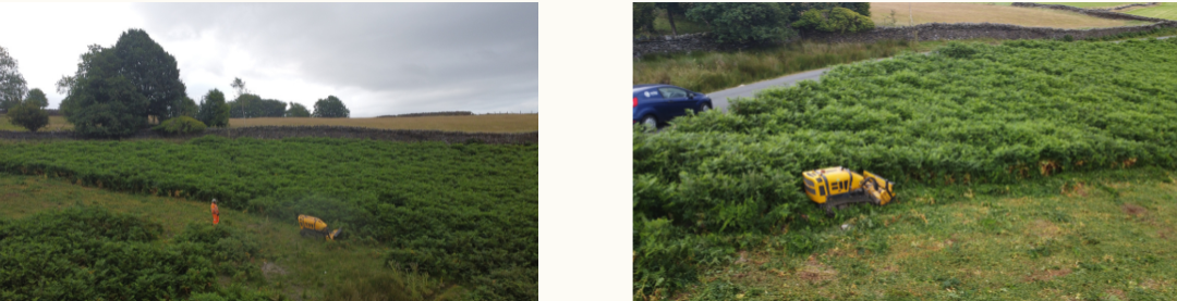 The site consisted of uneven, rocky terrain with several areas of historic fly-tipping. Many obstructions, including tyres and large stones, were hidden beneath dense bracken, posing risks to machinery and operatives. The open and remote nature of the site also required heightened attention to security, ensuring no equipment or fuel was left unattended overnight. Additionally, strict environmental protocols were required to prevent soil disturbance, protect habitats, and avoid disruption to wildlife in active grazing areas.